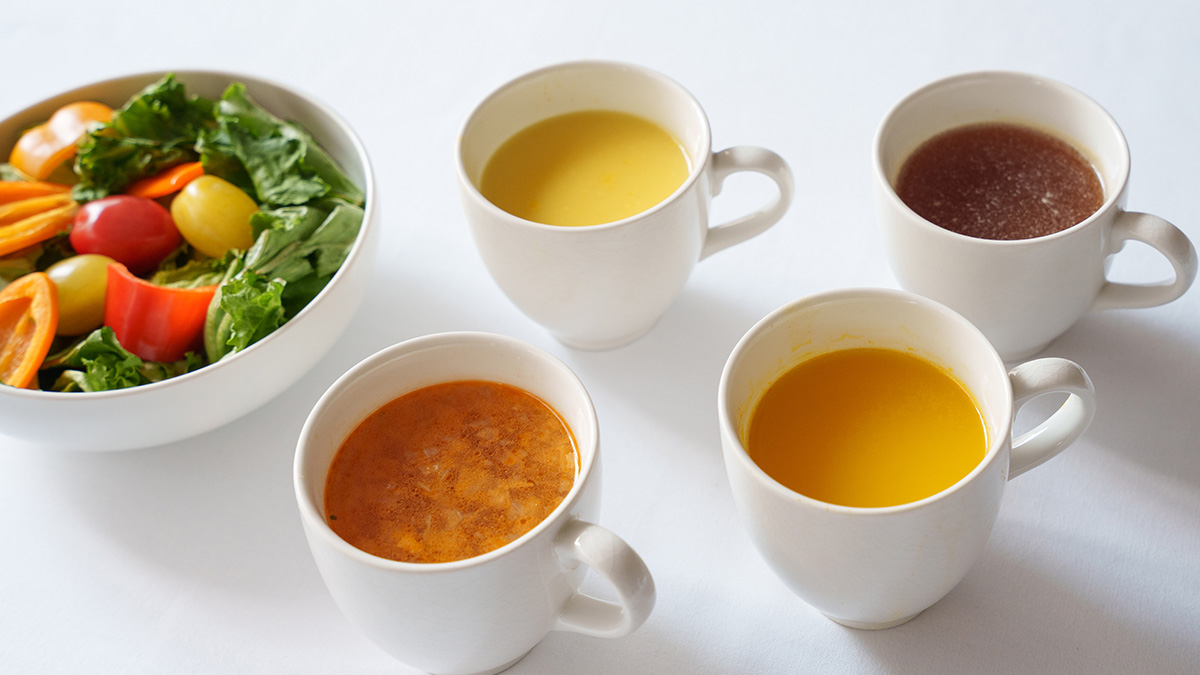 선명한 색감의 파프리카와 컬러풀한 미니 토마토는 과일처럼 달콤하여 채소를 잘 먹지 않는 분들에게도 추천합니다. 부드러운 식감이 인기인 로스트 포크나 매일 바뀌는 스프와 함께 즐겨보세요.