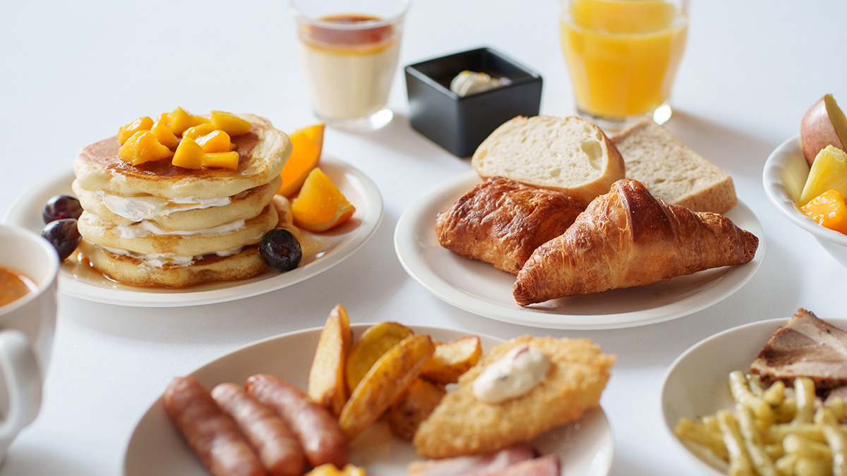 早餐供应刚烧好的蛋糕煎饼,还提供种类丰富的蔬菜和水果,打造多样化的西式自助餐。